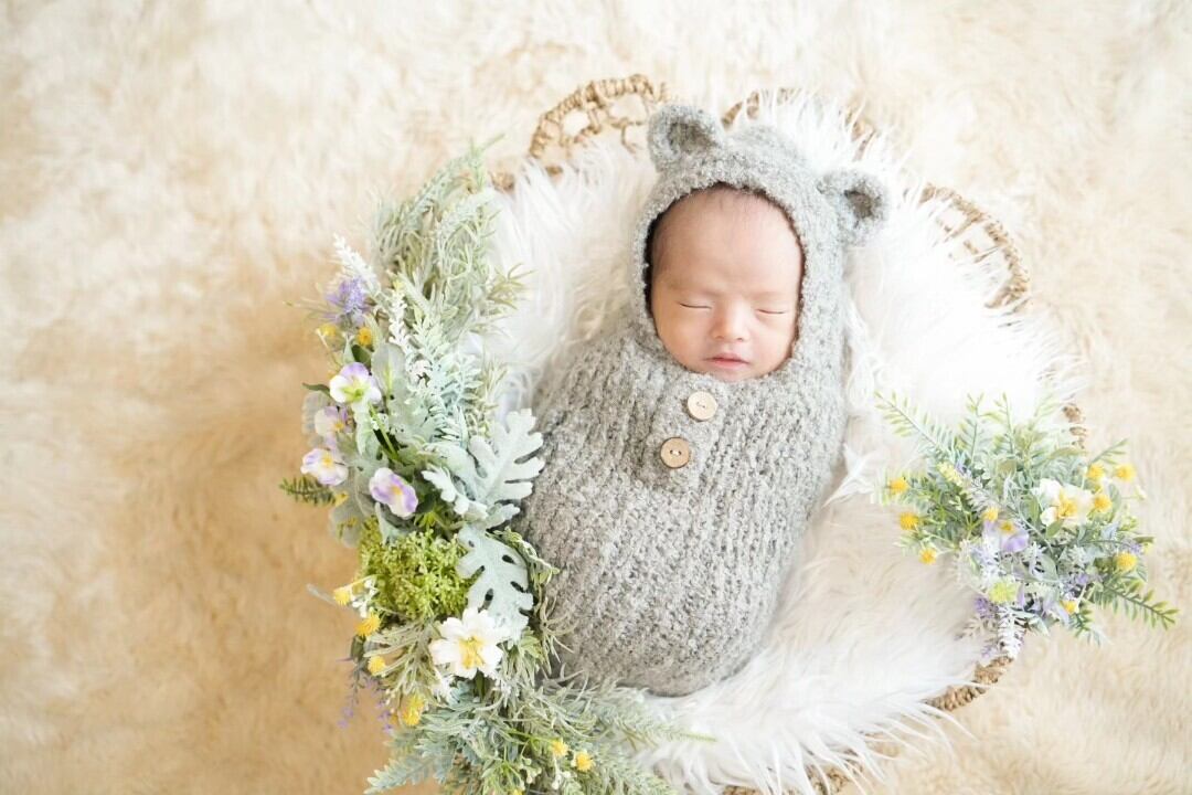 生後3週間というのは、おなかの中にいたころの状態に近い赤ちゃん、その神秘的な様子を写真にのこしてあげましょうというのが、ニューボーンフォトです。